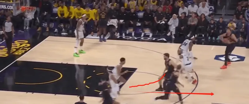 这个回合他从左侧底角 跑到弧顶 这么看感觉是艾顿要给他做个掩护 他绕出弧顶三分